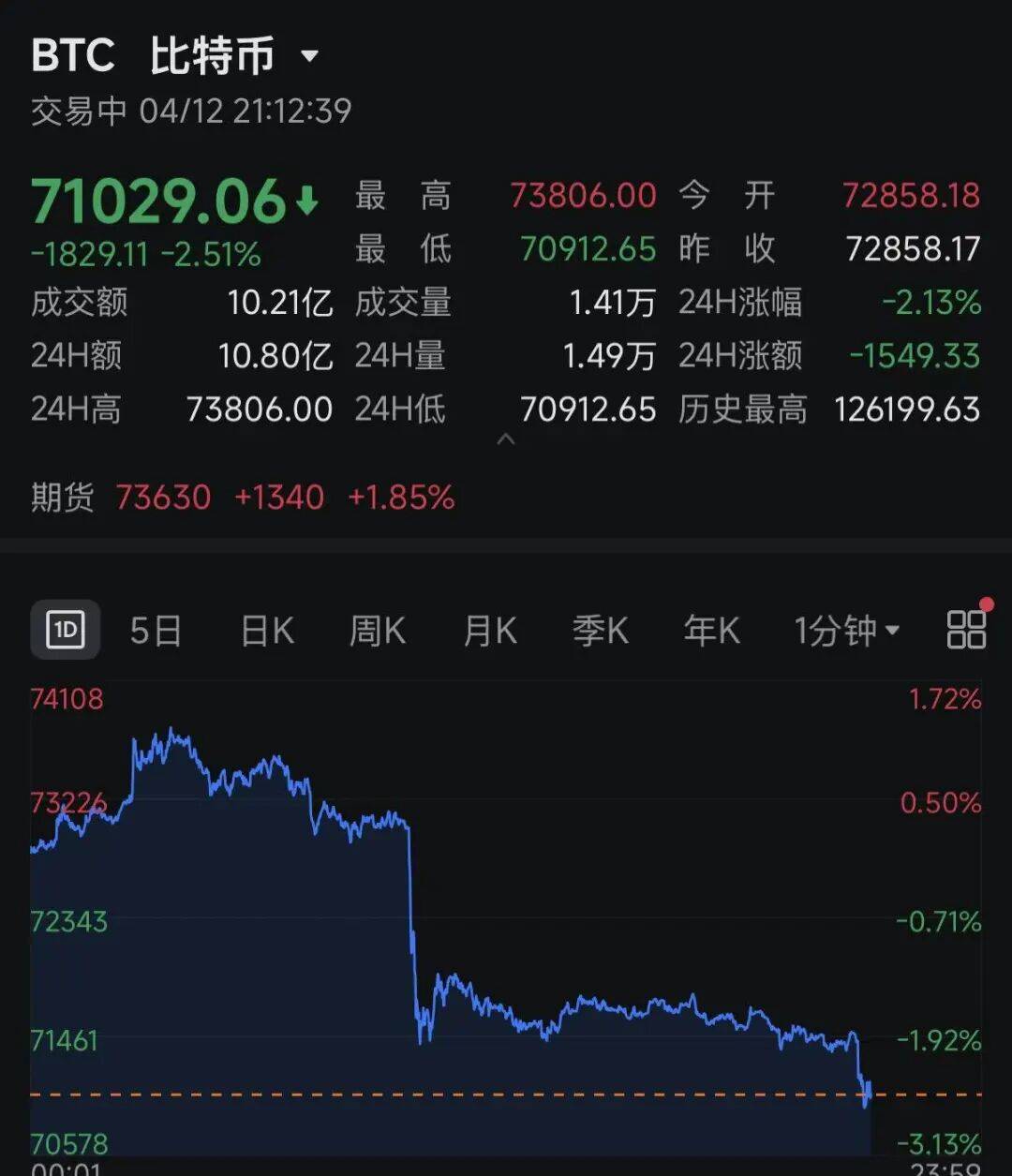 4月12日,加密货币集体大跌,截至发稿,比特币跌超2.5%,晚间进一步跳水,以太坊等加密货币也集体下行。截至发稿,加密货币有超11万人爆仓。